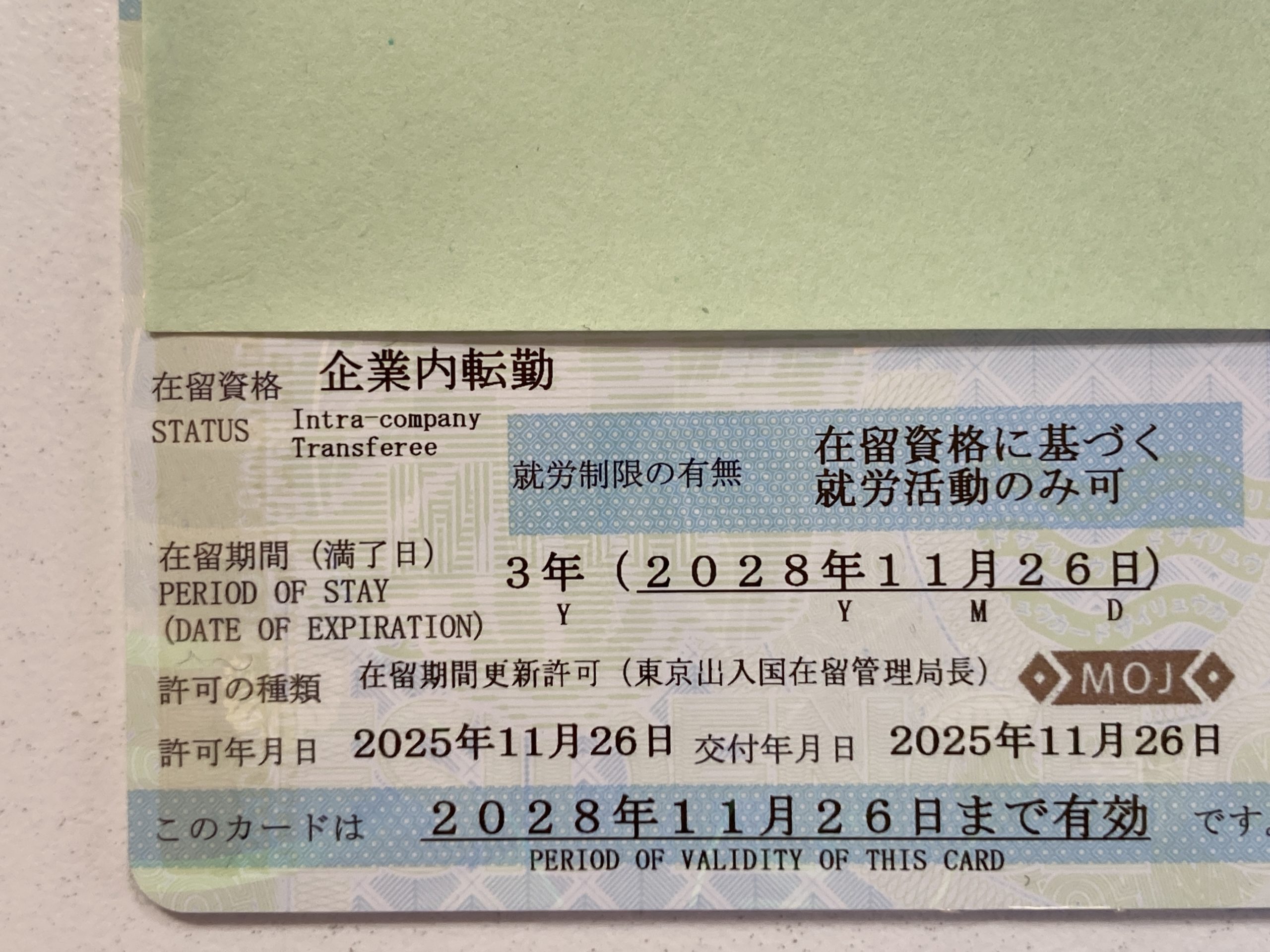 在留期間更新許可(企業内転勤) 業務日記 2025.11.27 在留資格「企業内転勤」の在留期間更新許可申請が無事に許可になりました。この度は、当事務所にご依頼いただきまして、誠にありがとうございました。 小林薫行政書士事務所